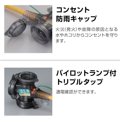 ●電源と機器の間に取り付け漏電・使い過ぎによる事故を未然に防ぐ後付け漏電遮断器付延長コード。現場の元電源保護に最適