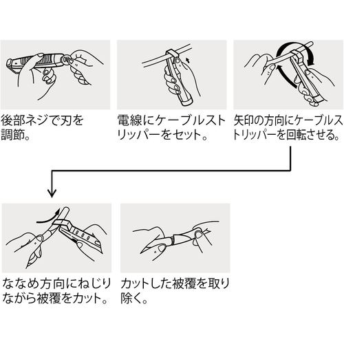 ●フック部を電線にセットして回転するだけで電線を傷つけないで被覆を簡単に切り取ることができます。
