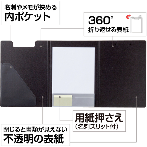 ●表紙は360°折り返せるので、閉じると書類が見えません。