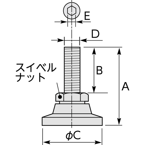 ●高さ調節は六角棒スパナでおねじを回すことにより、クランプ本体が上下します。また、スイベルナットを使用していますので前後左右に6°まで傾斜します。