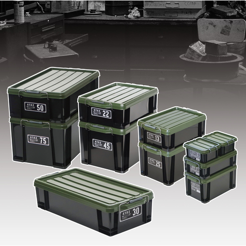 ●工具類やアウトドア収納に便利なバックル蓋付きコンテナです。