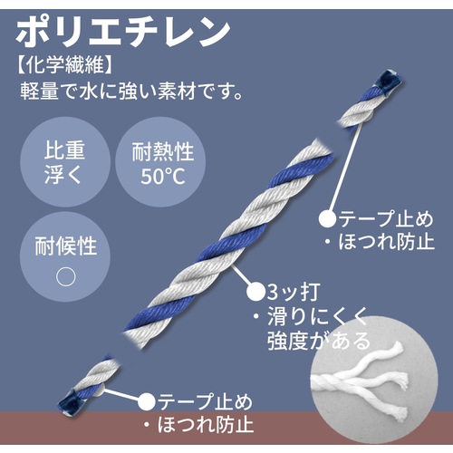 ●耐候性に優れ、軽量で水に強く、強力でショックにも強いロープです。