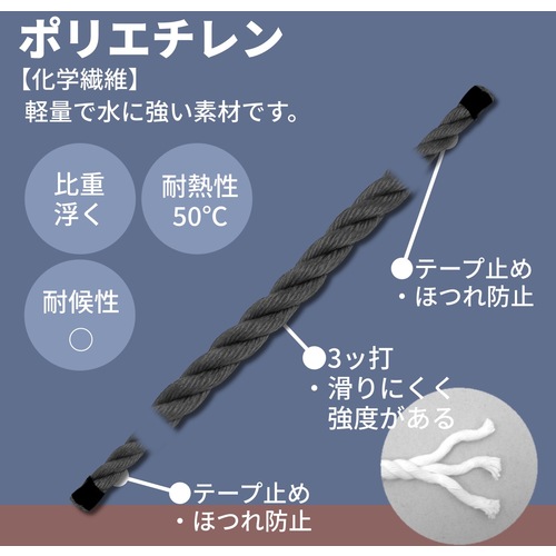 ●耐候性に優れ、軽量で水に強く、強力でショックにも強いロープです。