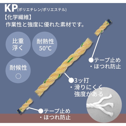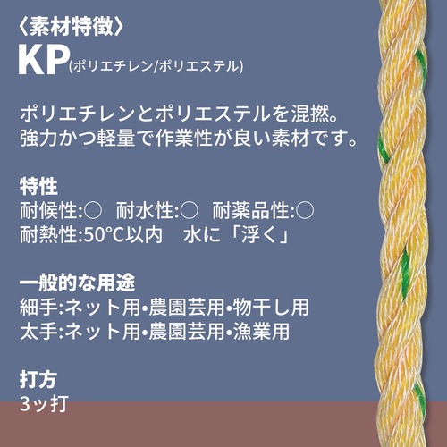 ●強力なポリエチレンの特性を生かし作業性をアップさせる為にエステル糸を混ぜ、軽量・強力・作業性が良いロープです。