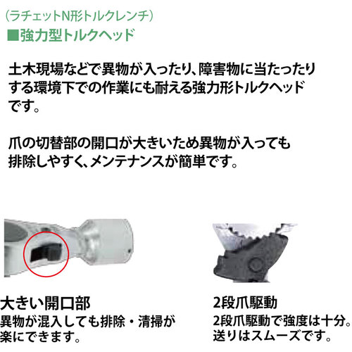 ●土木現場などで異物が入ったり、障害物に当たったりする環境下での作業にも耐える強力型トルクヘッドです。