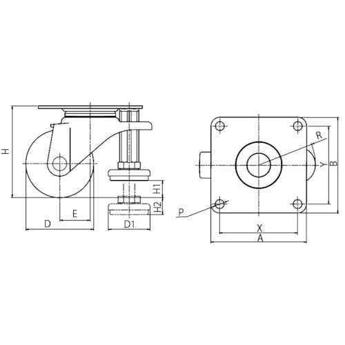9. ユーエイ プレート式 自在 アジャスター付キャスター グレーナイロン 車輪径60mm  AFタイプ SGW-AF型 取付寸法75×75 SGW-60GN-AF