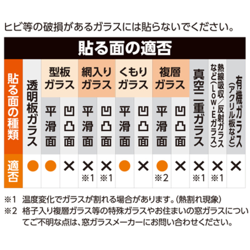 ●型板ガラスの凹凸面・網入りガラス(平滑面・凹凸面)・真空二重ガラス・熱線ガラス(LOW-Eガラス)・有機ガラス(アクリル板)にはご使用できません