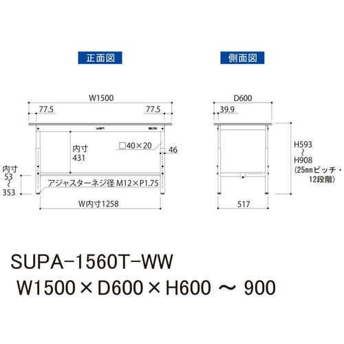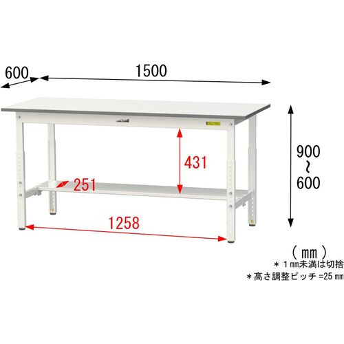 ヤマテック 軽量作業台 ワークテーブル150シリーズ 高さ調整タイプ 半面棚付 低圧メラミン天板 W1500×D600×H600~900mm シルキーホワイト SUPA-1560T-WW