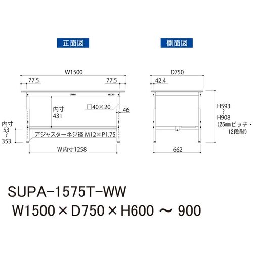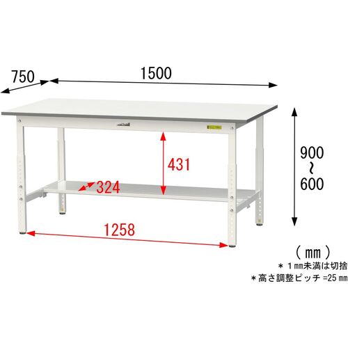 ヤマテック 軽量作業台 ワークテーブル150シリーズ 高さ調整タイプ 半面棚付 低圧メラミン天板 W1500×D750×H600~900mm シルキーホワイト SUPA-1575T-WW