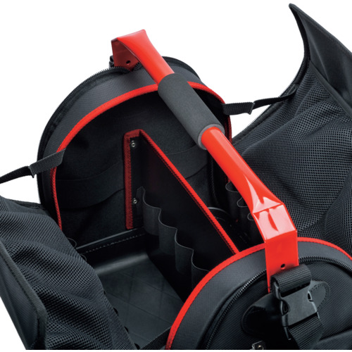 ●中にツールループ、プラスチックトレイ、ソフトグリップ付き鉄ハンドル、ツールベルトとしても使用できるショルダーストラップ付です。