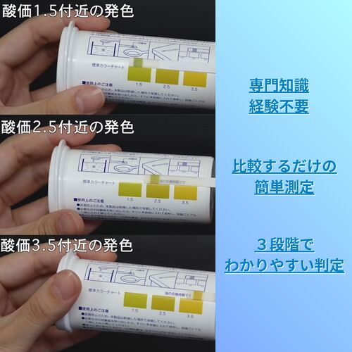 ●「弁当および総菜の衛生規範(昭和54年6月29日環食第161号)」では交換時期の目安を酸価値が2.5を超えたものとしており、2.5付近の測定が容易に行えます。