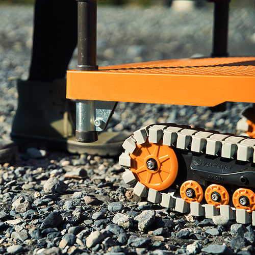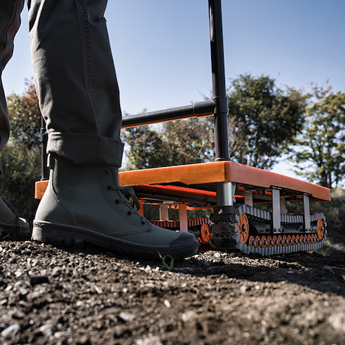 ●悪路でも搬送を可能にする、アクロスユニットを取り付けた押手を折りたたむことができる台車です。