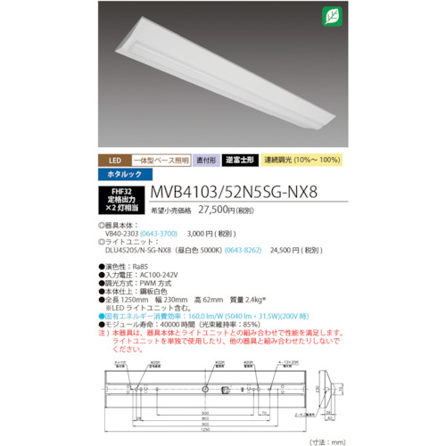 HotaluX ホタルック残光機能付LED一体型ベース照明Nu逆富士形230mm幅昼白色連続調光5200lm MVB4103/52N5SG-NX8