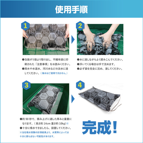 ●水道水や河川水などの淡水に浸して約90秒で高さ14cm、約10kgの水のうが完成します。