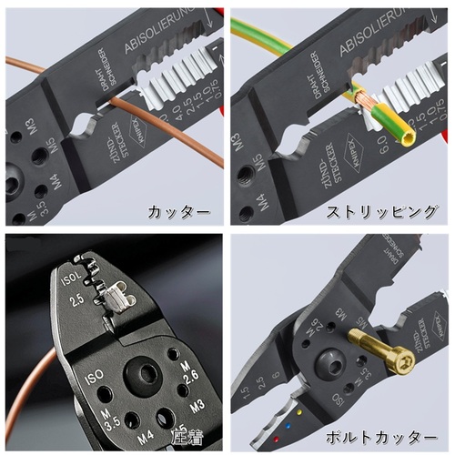 ●ケーブルの切断・ワイヤーのストリッピング(皮むき)・オープンバレル端子(6.3mm)の圧着が行えます。