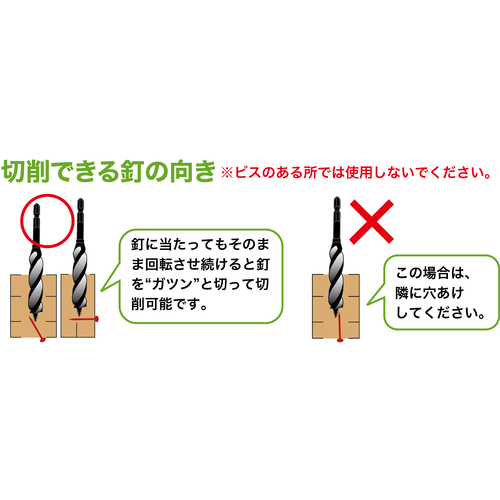 ●穴あけ途中で釘に当たってもガツンと切って進み穴あけ作業が行えます。