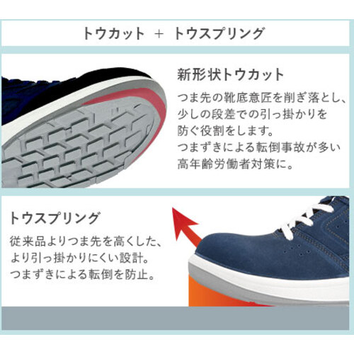 ●少しの段差での引っ掛かりを防ぐ役割をする新形状トウカットと、従来品よりつま先を高くしたトウスプリングで、労働災害の起因第一の「転倒(転倒時の類型で最多の”つまずき”」災害防止に役立ちます。