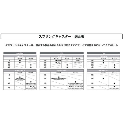 ●適合機種:■FGN・FGK-3段(正面幅800mm以上の作業台に背面手すりを使用する場合は使用できません)■FGC-3段(3690-25、3690-30及び正面幅800mm以上の作業台に背面手すりを使用する場合は使用できません)■FGN-46**・FGK-4段・FGC-46100・FGC-46120・FGR-4段(背面手すりを使用する場合は使用できません)■FGR-3段※本体+手すりの場合に適合します(作業台本体のみ使用の場合SC-2Aをご確認ください)
