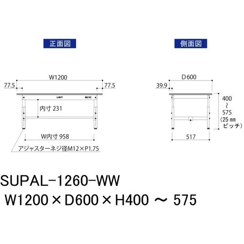ヤマテック 軽量作業台 ワークテーブル150シリーズ 高さ調整タイプ低床用 W1200×D600×H400~H575mm SUPAL-1260-WW