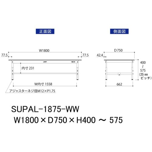 ヤマテック 軽量作業台 ワークテーブル150シリーズ 高さ調整タイプ低床用 W1800×D750×H400~H575mm SUPAL-1875-WW