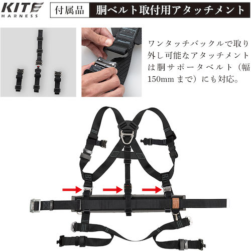 ●ワンタッチバックルで取り外し可能なアタッチメントは胴サポーターベルトにも対応。ワークポジション用の柱上作業用ベルトも装着可能。