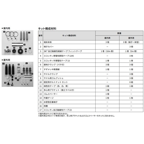 ●端末本体X3個、3M[[TM上]]自己融着性絶縁テープ(フィットテープ)X1巻(10m)、3M[[TM上]]半導電性テープ13X1巻、接地クランプ(パテ付き)X3個、すずメッキ軟銅線X1個、相色別テープ(赤、白、青)X1組、多心用ブラケット(施工ラベル付き)X1個、ゴムスペーサーX1個、作業ゲージX1枚