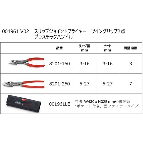 ●8201-150(全長150mm、調整3段階、掴み能力3-16mm)●8201-250(全長250mm、調整7段階、掴み能力5-27mm)●0019-61LE ツールロール(4ポケット付き)