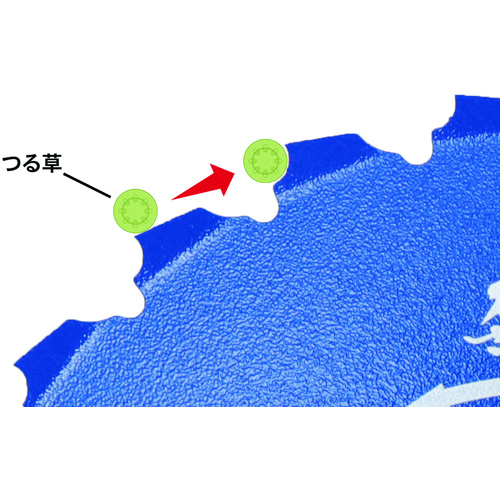●上曲げの刃でギアケースへの巻き付きを防止し、つる草を呼び込む特殊刃型と特殊R形状刃で効率よくつる草を切断可能です。
