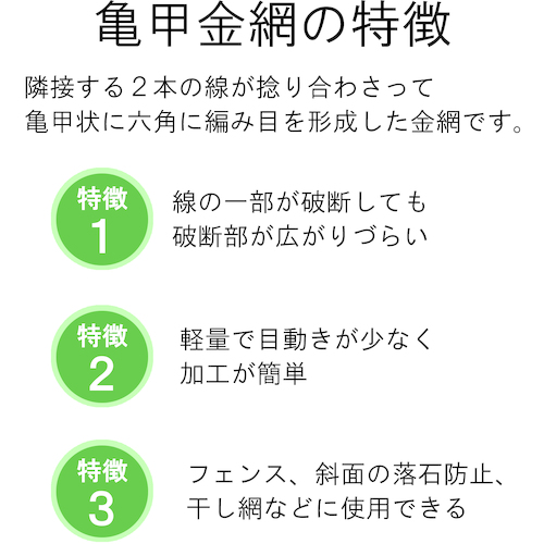 ●線の一部が破断しても破断部が裂け広がりづらい特性を持ち、軽量で目動きが少なく加工が簡単です。
