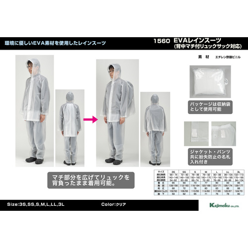 9. カジメイク EVAレインスーツ(マチ付リュックサック) クリア L 1560-90-L