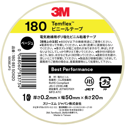 3M Temflex(テムフレックス) ビニールテープ 180 ベージュ 50mm x 20m 180 BEI 50X20