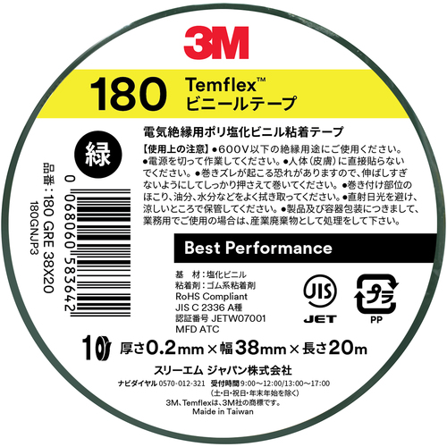 3M Temflex(テムフレックス) ビニールテープ 180 グリーン 38mm x 20m 180 GRE 38X20