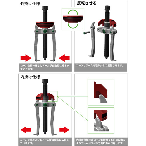 ●アームと円錐コーンを反転させれば内掛けプーラーとしても使用でき、スライドハンマーやカウンターステイとも併用できます。