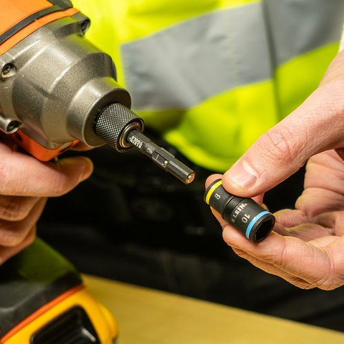 ●交換用ソケットはシャフトに直接取り付けて収納できるため、作業中や持ち運び時に紛失しにくく、工具箱の中でも散らかりません。