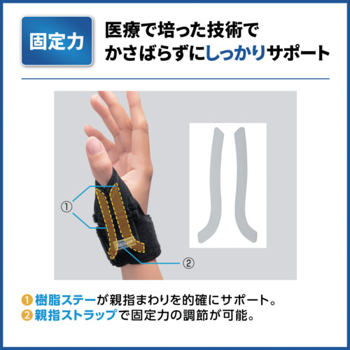 ●内蔵された樹脂ステーと親指ストラップにより、親指まわりのトラブルをサポートします。