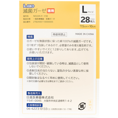 ニッシン 医療ガーゼ エルモ滅菌ガーゼ徳用28枚入 ホワイト Lサイズ7.5cmX10cm 781586