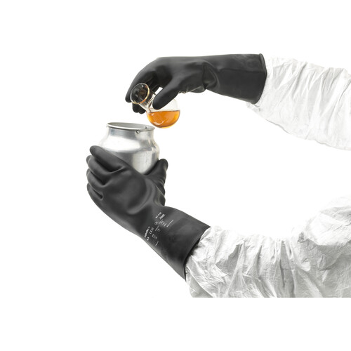 ●厚手の天然ゴムラテックス手袋で、化学薬品に対して優れた保護性能を発揮します。
