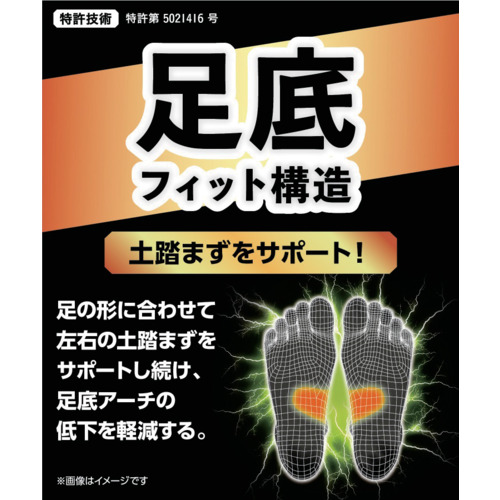 ●足底フィット構造・・・足の形に合わせて左右の土踏まずをサポートし続け、足底アーチの低下を軽減。(特許技術:特許第5021416号)