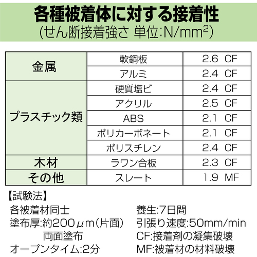 ●金属、プラスチック、木材、コンクリート等幅広い素材を強力に接着可能です。