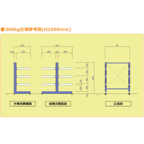 ●アーム1本当たりの耐荷重は300kgですので、荷をアーム2本で受ければ600kg、3本で受ければ1500kgが一段当たりの耐荷重となります。