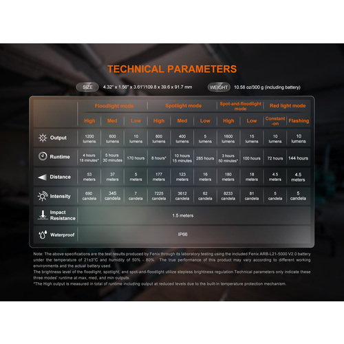 ●投光照明モード 明るさ/時間/照射距離:1200lm/4時間18分/53m(強)600lm/5時間30分/37m(中)、10lm/170時間/5m、(弱)