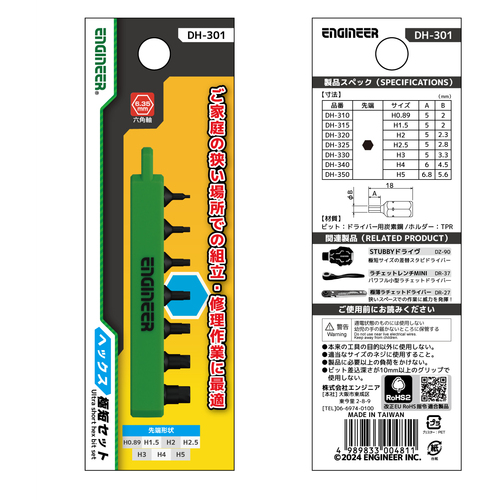 9. ENGINEER ドライバービット ヘックス極短セット 7本組 六角穴対辺0.89-5mm DH-301