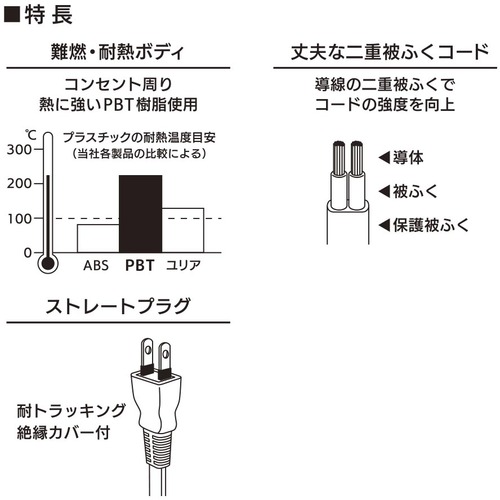●コンセント周りに熱に強いPBT樹脂使用した、難燃・耐熱ボディです。