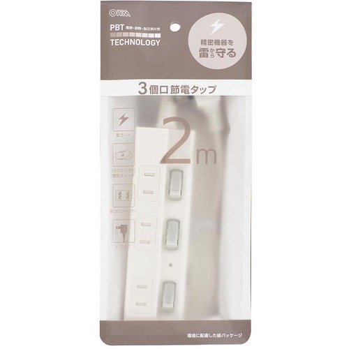 OHM 3口2m節電タップ雷ガード付22 HS-TPK32W-22