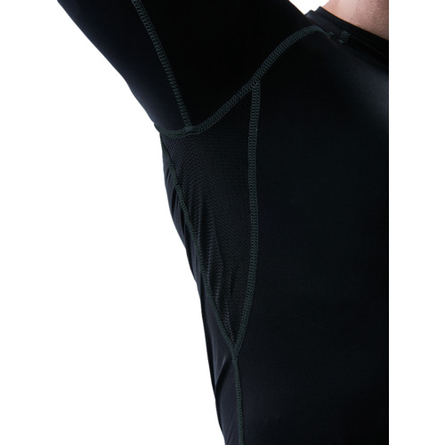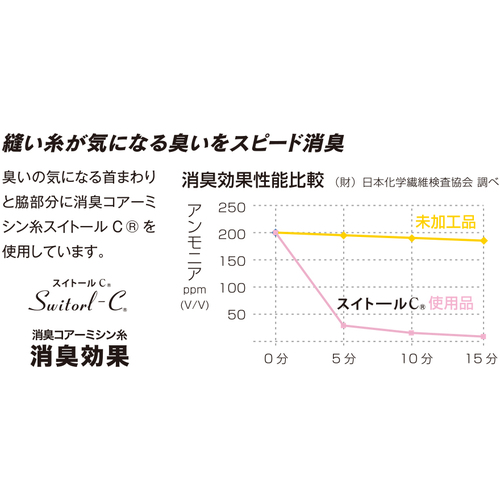 ●臭いの気になる首周りと脇部分に消臭コアーミシン糸を使用し消臭効果を発揮します。
