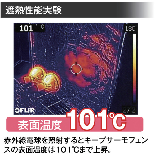 ●不燃素材で輻射熱97%カットを実現した特殊遮熱シートのキープサーモウォールスペシャルを利用した遮熱・溶接遮光フェンスです。