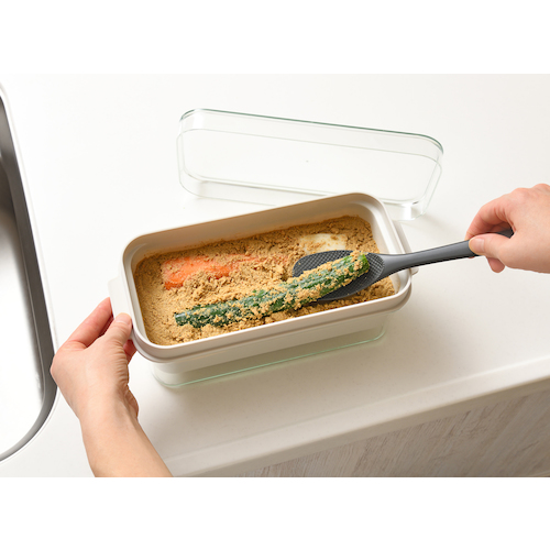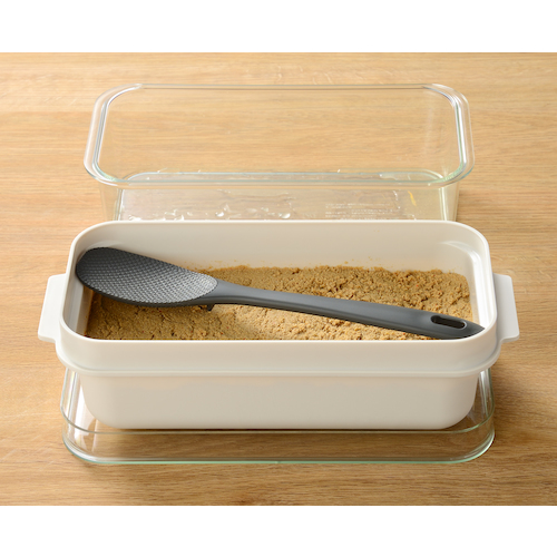 ●ぬかを混ぜたり野菜を取り出す時に便利な専用しゃもじ付きです(ぬかが付きにくいWエンボス加工)。