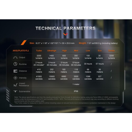 ●ターボモード 明るさ/点灯時間/照射距離:3200lm/約2時間20分/410m