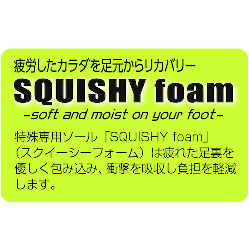 ●特殊専用ソール「SQUISHY foam(スクイーシーフォーム)」は疲れた足裏を優しく包み込み、衝撃を吸収し負担を軽減します。