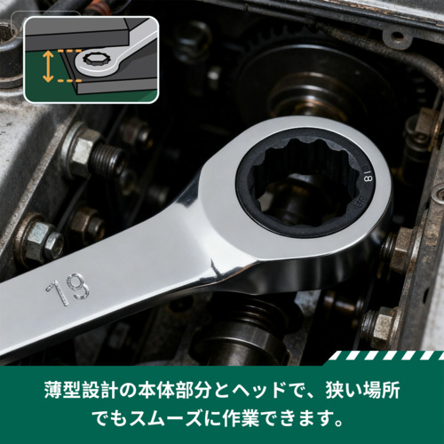 ●ギア数72、ラチェットボックスエンドの送り角度はわずか5度、狭い場所でも快適に作業できます。